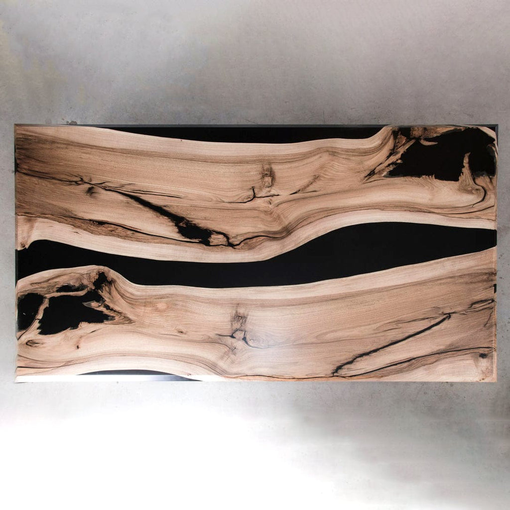La résine épouse naturellement les formes du bois et rend chaque plateau absolument unique : aucune table ne peut être reproduite à l’identique.