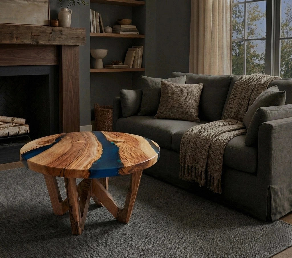 Chaque plateau est façonné à partir d’un tronc véritable. Les nervures naturelles du noyer, vieilles de plusieurs décennies, dialoguent avec une résine translucide inspirée des lagons tropicaux. Le résultat : une pièce chaleureuse, contemporaine et artistique à la fois.